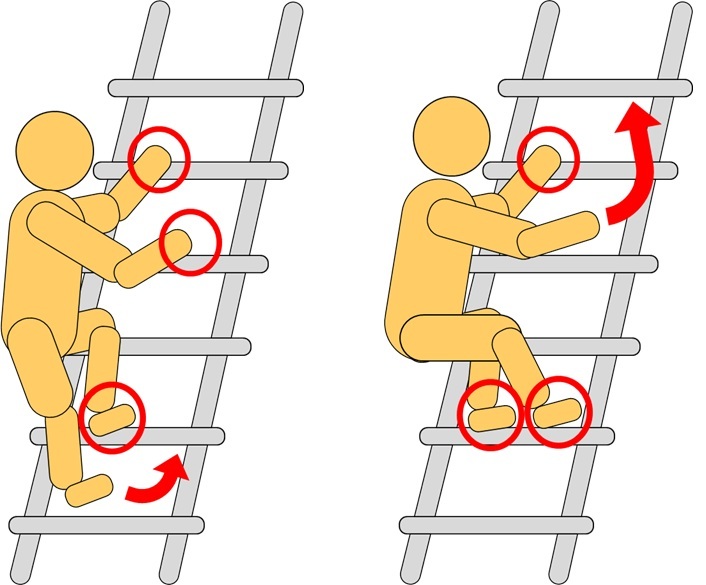『3点支持』とは両手・両足のうち常に3点で体を支え、片手または片足1点を動かすことでバランスを保つ動作で、転落リスクを大幅に低減する効果があります。