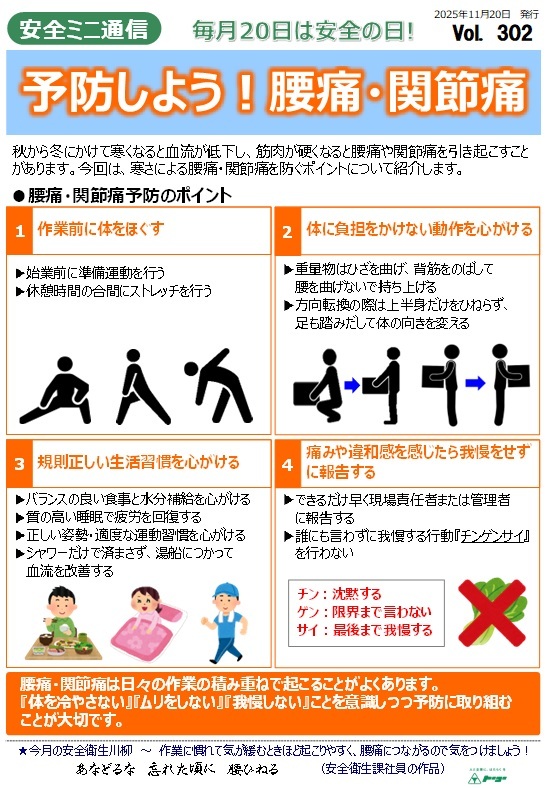 安全ミニ通信302号を発行しました(予防しよう!腰痛・関節痛)